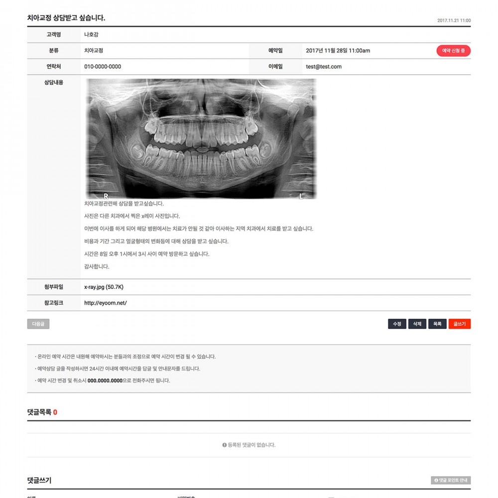 제작된 게시판 스킨은 치과를 예로 들어 만들어 졌으며 심플한 디자인에 상담예약 날짜와 문의를 간단히 하는 용도로 제작되었습니다.